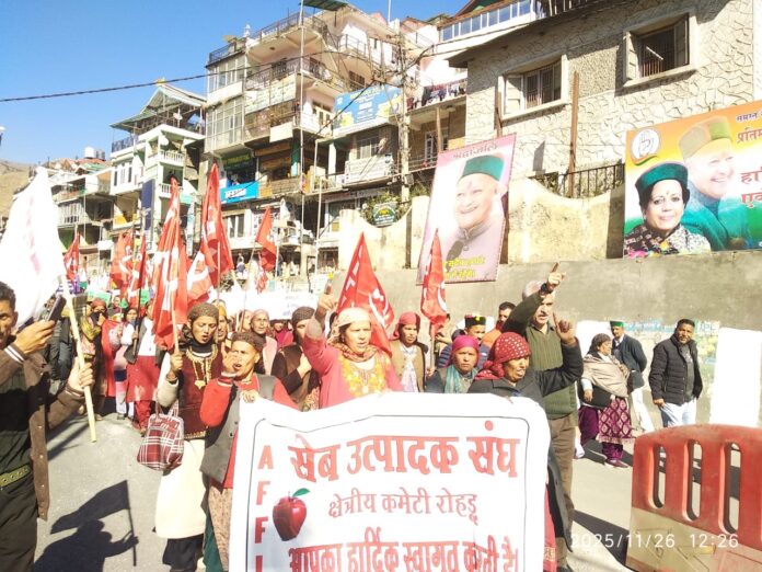देश प्रदेश में किसान व मज़दूर विरोधी नीतियों के विरोध प्रदर्शन में आज हिमाचल सेब उत्पादक संघ प्रदेश के सेब बहुल क्षेत्रों में ब्लाक स्तर पर अपनी मांगों के समर्थन में अन्य संगठनों के साथ एकजुटता प्रदर्शित करने के लिए इस प्रदर्शन में शामिल हुआ।